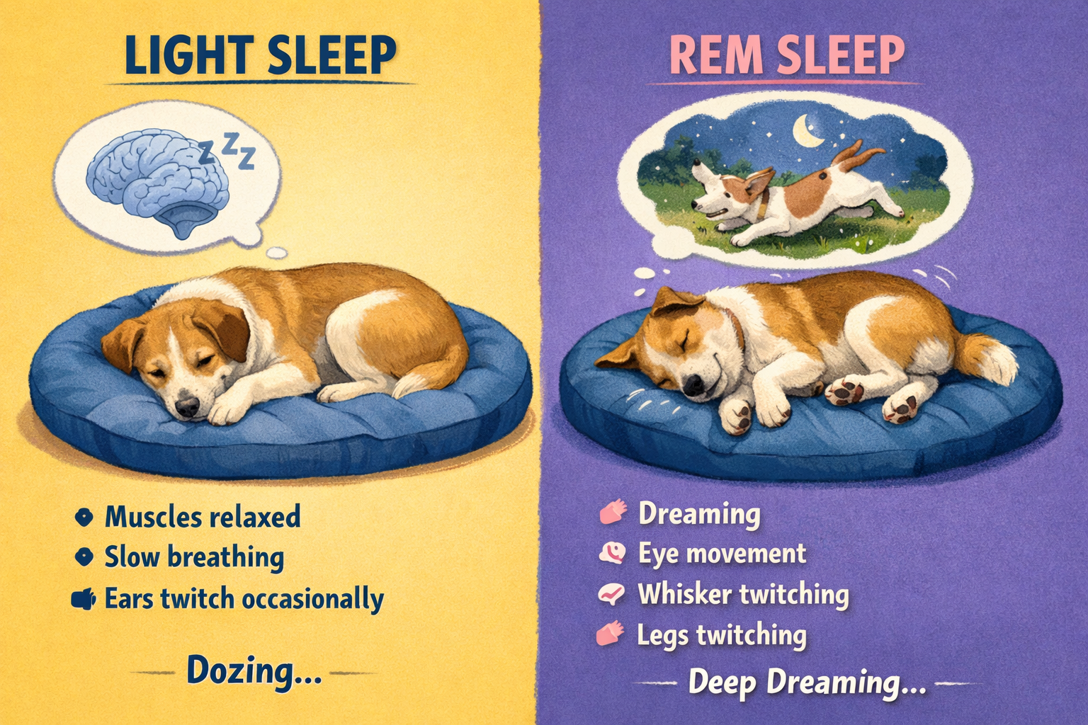 Dogs spend only 10–12% of sleep in REM, compared to 20–25% in humans. Light sleep helps dogs process information, store memories, and stay alert. Frequent naps throughout the day allow them to accumulate enough rest for healthy functioning.