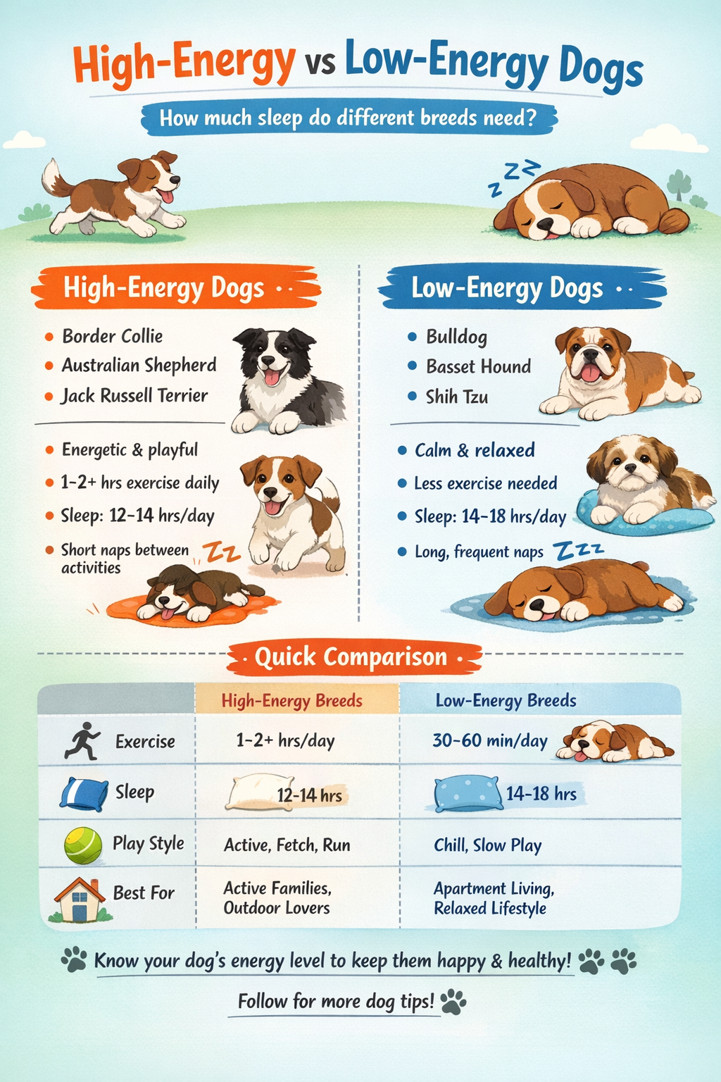 - High-energy breeds (like Border Collies) sleep less but require more mental and physical stimulation.