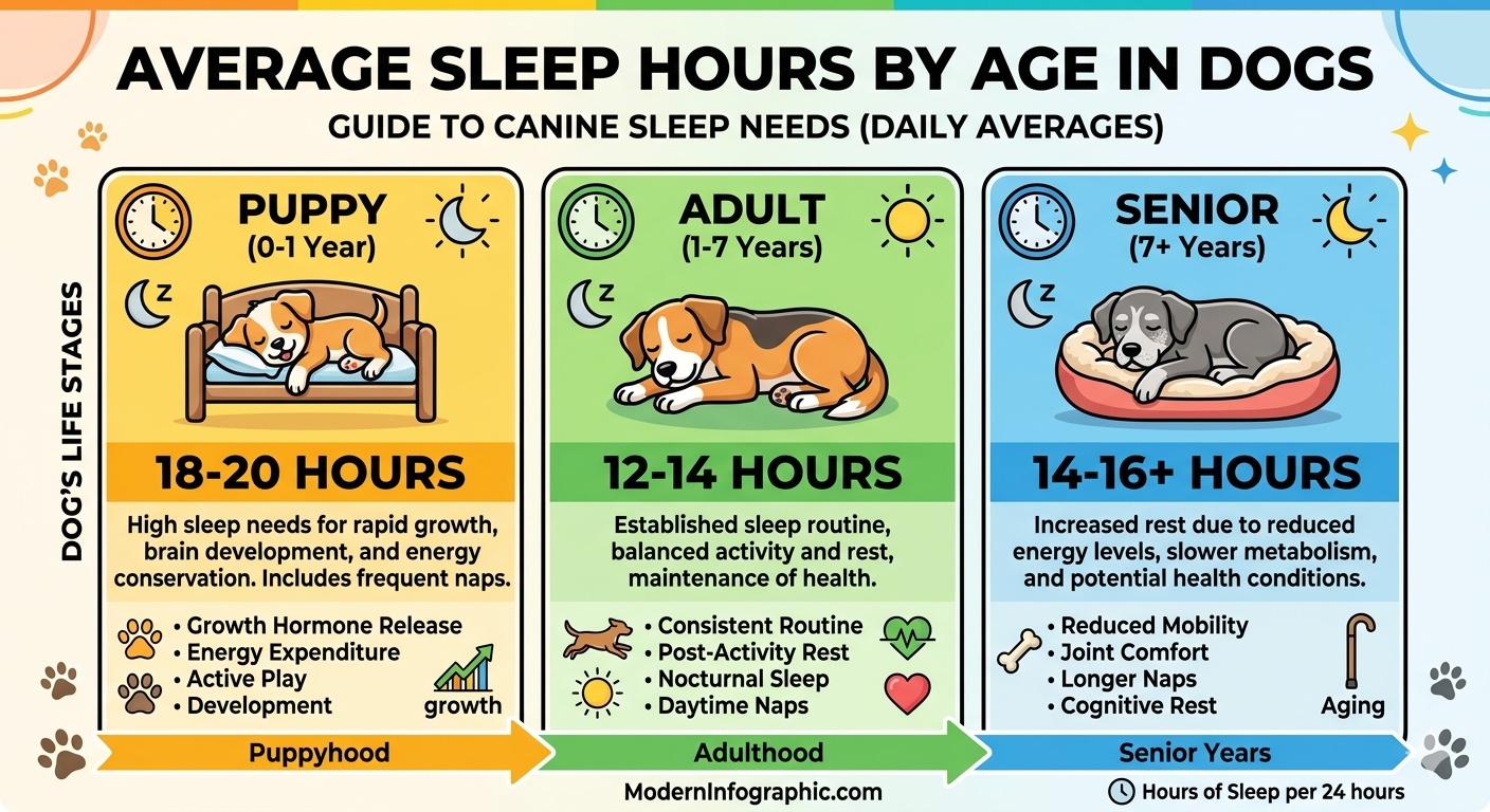 - Puppies: Sleep 18–20 hours daily. Sleep is crucial for brain development, growth, and learning new skills.